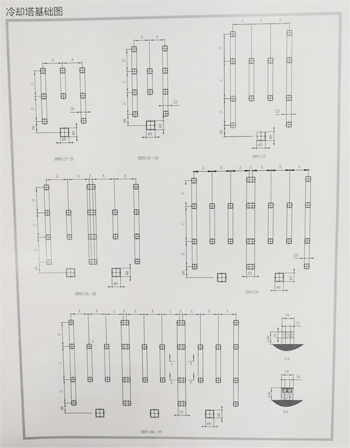 代碼中的數字表示冷卻塔的規格,也即設計工況下單臺冷卻水量,單位為 m3/h(立面及基礎圖所 示為二臺塔,實用可單排多臺,或雙排多臺)。