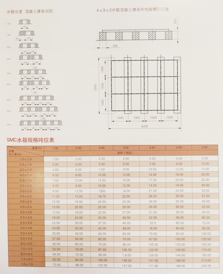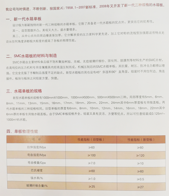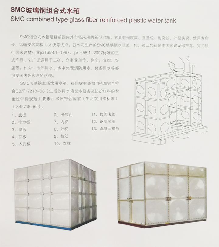 SMC玻璃鋼水箱特點 SMC組合式玻璃鋼水箱是目前國際上采用的新型水箱。其特點是采用食品級樹脂,因此水質好,清潔無污染;具有強度高,重量輕,耐腐蝕,外型美觀,使用壽命長,保養管理方便等特點。 SMC組合式玻璃鋼水箱是由SMC模壓板塊、密封材料、金屬結構件及配管系統現場組裝而成。給設計和施工帶來極大方便。一般水箱按標準設計,特殊水箱需要專門設計??筛鶕脩粜枰M裝0.125-1500m3的水箱。若原有水箱需要更換,不需要改造房屋,適應性很強。專門研制的定型產品密封帶,該密封帶無毒、耐水、彈性大、永久變型小,緊固密封。水箱整體強度高,無滲漏,無變形,保養、檢修方便。 SMC模壓單板性能及規格 SMC水箱是采用食品級樹脂生產的SMC片材,經高溫、高壓、機械壓制而成。 在制造工藝上,采取機壓成型的制作方法。增加了抗震、抗沖擊的強度,克服了手糊制品強度不均勻的缺陷,提高了耐壓強度和使用壽命 在外型設計上,板塊中部呈凹陷弧度,提高了水箱的承壓能力,同時板塊四周設有45°和90°的凸緣,組裝時不用邊角連接件,更具有柔韌性和靈活性,水箱板塊規格有:1000×1000mm;1000x500mm;500×500mm。厚度有4mm,6mm,8mm,10mm,12mm,14mm,16mm,18mm,20mm其中4mm厚度板材專用做水箱蓋板。因而可任意拼裝成所需容量的水箱。 SMC玻璃鋼水箱用途 廣泛適用于工礦、企事業單位、住宅、賓館、飯店等建筑,作為生活飲用水、中水處理、消防用水及其他用水儲水設施。