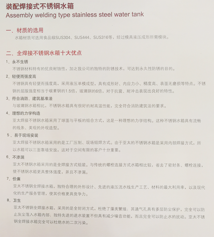 6、不滲漏,本公司生產(chǎn)的不銹鋼水箱采用的是全焊接方式組裝,與傳統(tǒng)的螺栓連接方式水箱相比較,省去了密封條、螺栓連接,使不銹鋼水箱更具整體強度,并且不滲漏。