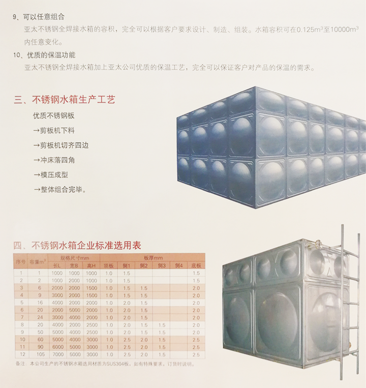 不銹鋼水箱常見的有不銹鋼消防水箱,方形組合式水箱、立式圓形水箱、臥式圓形水箱。采用SUS304SUS316LSUS444等不銹鋼板,沖壓成型。一般沖壓成三種尺寸,分別是1x1米、1x0.5米和0.5x0.5米三種,周邊用鎢極氬弧焊接,具有強度高、重量輕、成本低、環(huán)保衛(wèi)生等特點。制造標準為國家建筑標準02s101設計圖集。