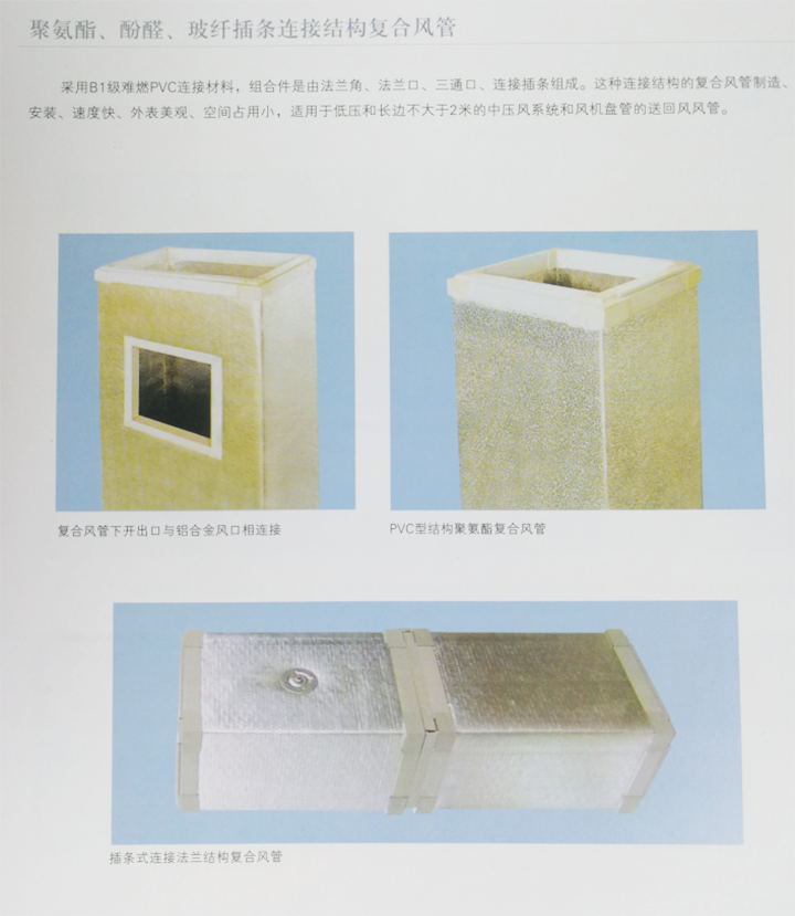 酚醛復合風管中間層為酚醛泡沫,內外層為壓花鋁箔復合而成。酚醛泡沫板與鋁箔復合制成夾芯板,然后加上專用法蘭配件,制成的酚醛復合風管用于中央空調通風。酚醛復合夾芯板其內外表面是涂層鋁箔,中間層為酚醛泡沫材料,其綜合性能有較大的改觀,特別是在力學性能方面,如抗彎曲性、抗壓、脆性及加工性能等方面都有較大的改進,基本上滿足了空調通風管的使用要求。